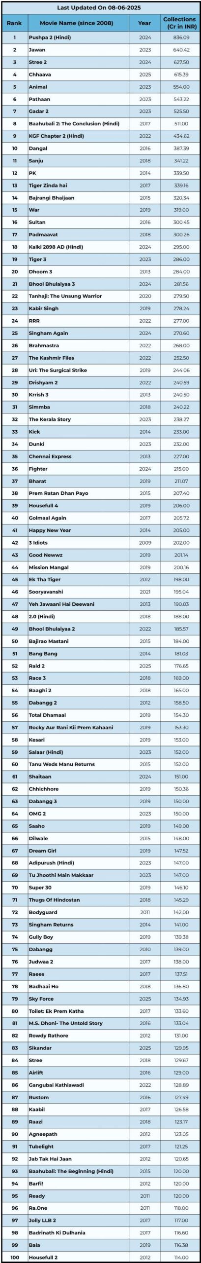 Take a look at the Bollywood movies & Hindi dubbed versions of South films that have entered the 100 crore club at the Indian box office!